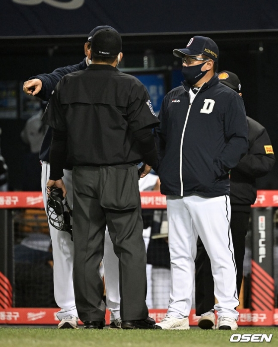 그런데 이 과정에서 스윙 후 페르난데스의 몸이 기울어졌고, 김인태의 도루 시도를 막으려던 포수 유강남(30)의 송구 동작을 방해했다. 주심은 곧바로 페르난데스의 수비방해를 선언했고, 순식간에 아웃카운트 2개가 올라갔다. 김태형 감독이 항의해봤으나 소용이 없었다.