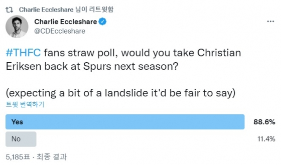 이러한 에릭센의 인간 승리에 토트넘 팬들도 크게 감동한 모양새다. 디 애슬레틱에서 토트넘을 맡고 있는 찰리 에클셰어가 SNS를 통해 조사한 바에 따르면 토트넘 팬 약 89%가 에릭센의 복귀를 찬성했다.