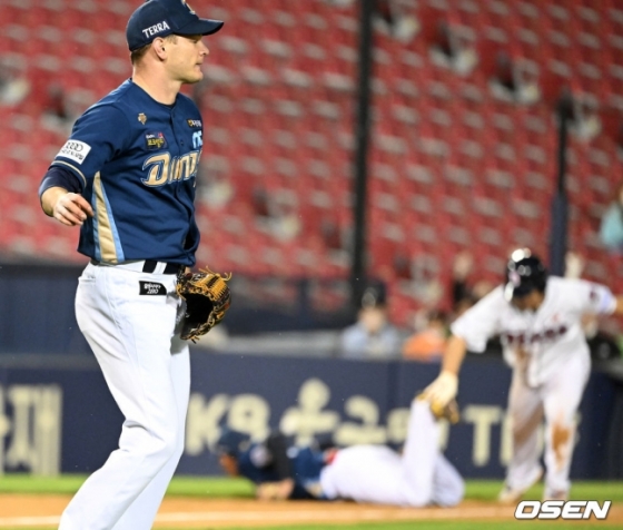 이어 스탁도 3회 초 곧바로 실점했다. 선두타자 오영수(22)의 좌중간 2루타와 김기환(27)의 내야안타 등으로 만든 2, 3루 찬스에서 손아섭(34)이 유격수 땅볼로 3루 주자를 불러들였다. 그렇지만 아직은 대량실점의 기미가 보이지 않았다.