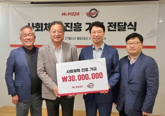 미스터피자는 "27일 서울 방배동 MP대산 본사에서 (사)고양위너스 독립야구단과 후원금 전달식을 가졌다"며 "행사에는 MP그룹 이종영 대표와 고양위너스 김장헌 이사장, 양승호 총괄단장 등이 참석했다"고 28일 밝혔다.