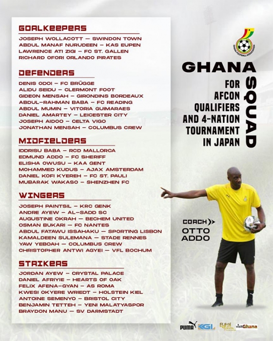 가나축구협회(GFA)는 27일(한국시간) 오는 6월 마다가스카르, 중앙아프리카공화국과의 아프리카 네이션스컵 예선과 일본에서 열리는 4개국 친선대회(기린컵)에 나설 33명의 대표팀 명단을 발표했다. 주장 안드레 아예우(알 사드)가 월드컵 예선 2경기 출장 징계를 마치고 돌아온 가운데 무바라크 와카소(선전FC)와 조나단 멘사(콜럼버스 크루), 카말딘 술레마나(스타드 렌) 등도 대표팀 명단에 복귀했다.