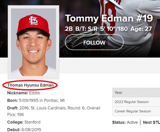 [세인트피터스버그(미국 플로리다주)=이상희 통신원] 김현수(34·LG)는 메이저리그 볼티모어와 필라델피아 소속으로 두 시즌을 뛴 뒤 2018년 한국프로야구(KBO)로 복귀했다. 그런데 현재 메이저리그에 그와 같은 이름을 가진 선수가 있다. 주인공은 세인트루이스 2루수와 유격수로 뛰는 스위치 히터 토미 에드먼(27)이다.