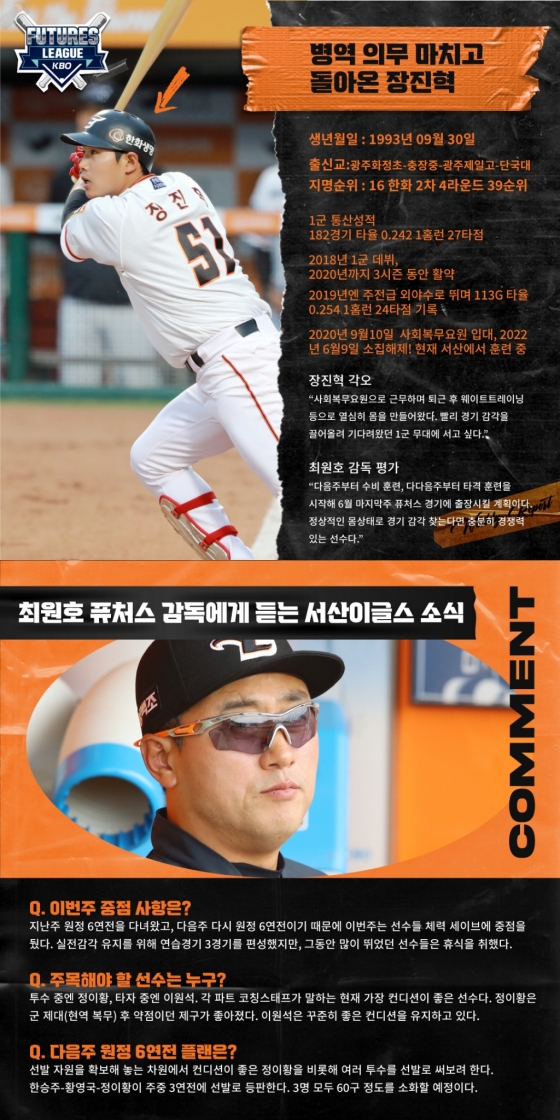 장진혁도 1군 무대에 복귀할 날만을 기다리고 있다. 장진혁은 "사회복무요원으로 근무하는 동안, 퇴근 후 웨이트 트레이닝을 꾸준히 하면서 몸을 만들었다. 빨리 경기 감각을 끌어올려 기다려왔던 1군 무대에 서고 싶다"고 각오를 다졌다.