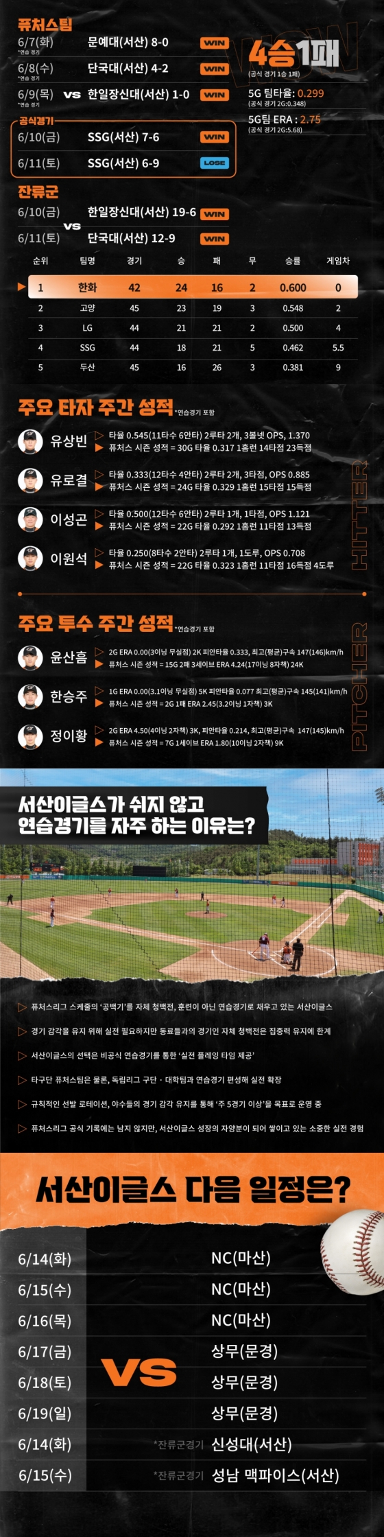 한편 한화 퓨처스 팀(북부리그 1위·24승2무16패)에는 장진혁을 비롯해 1군행을 꿈꾸는 많은 선수들이 구슬땀을 흘리고 있다. 공식 퓨처스리그 경기가 없는 날에는 연습 경기를 편성, 실전 기회를 부여하고 있다. 구단은 "규칙적인 선발 로테이션 및 선수들의 경기 감각 유지 차원"이라고 이유를 설명했다. 7일에는 문예대를 8-0, 8일엔 단국대를 4-2, 9일에는 한일장신대를 1-0으로 각각 제압했다.
