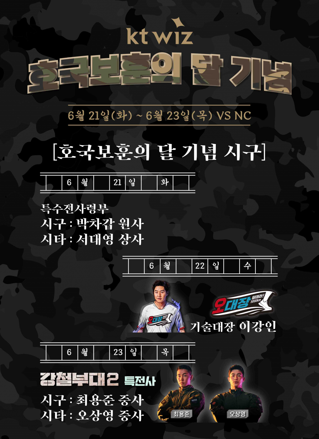 주중 시리즈의 마지막 날인 23일에는 지난 5월 말 인기리에 종영한 밀리터리 예능 프로그램 '강철부대2'에서 7개의 최강 특수 부대들과 경쟁 끝에 우승한 육군 특수전사령부 팀의 팀장 최용준 중사와, 오상영 중사가 각각 시구·시타를 맡는다.