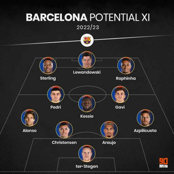 영국 매체 ‘90min’은 지난 26일(현지시간) 2022/2023시즌 바르사의 예상 라인업을 공개했다. 예상 라인업 중 페드리, 가비, 로날드 아라우호, 마크 안드레 테어-슈테겐을 제외하고 변화 폭이 컸다.