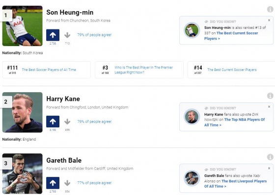 손흥민이 1위를 차지했다. 그 뒤로는 해리 케인, 가레스 베일(LA FC), 지미 그리브스, 게리 리네커 순으로 TOP5에 들었다. 6위부터 10위까지는 로비 킨, 위고 요리스, 레들리 킹, 폴 개스코인, 글렌 호들이 이름을 올렸다.