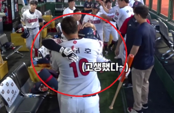 이날 정훈의 홈런 뒤 재미있는 장면이 포착됐다. 더그아웃 뒤쪽에 있던 이대호가 홈런이 나오자 곧바로 더그아웃으로 돌아왔다. 그리고는 정훈과 진한 포옹을 하며 축하해주는 모습이 나왔다.