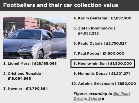 [스포탈코리아] 곽힘찬 기자= 손흥민(토트넘 홋스퍼)이 보유 슈퍼카 가치에서 축구 선수 중 전체 8위에 올랐다.
