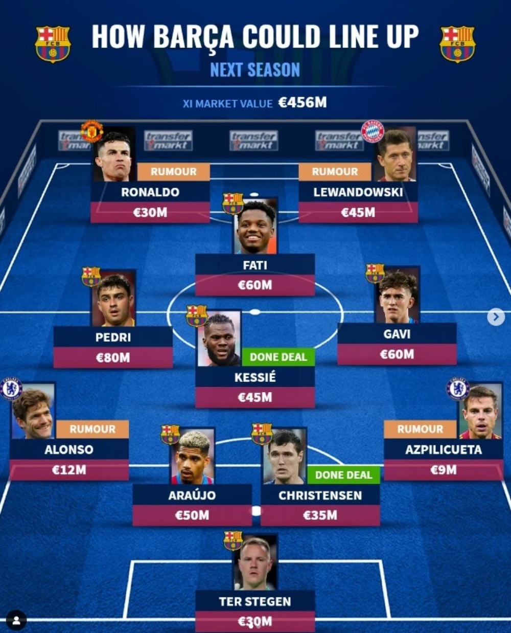 그 뒤를 안수 파티가 지원하고 페드리, 프랭크 케시에, 가비가 자리했다. 포백 라인은 마르코스 알론소(첼시), 로날드 아라우호, 안드레아스 크리스텐센, 세자르 아스필리쿠에타(첼시)가 구성했다. 크리스텐센 영입은 확정됐고 알론소와 아스필리쿠에타는 양 측이 접촉 중이다. 골키퍼 장갑은 안드레 테어 슈테겐이 꼈다.