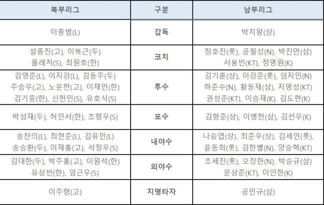 이에 맞서 상무 야구단 박치왕 감독이 이끄는 남부리그 올스타(3루 덕아웃, 후공)는 김기훈, 김형준, 나승엽, 최준우(이상 상무), 이강준, 김세민, 윤동희, 조세진(이상 롯데), 임지민, 하준수, 김한별, 오장한(이상 NC), 황동재, 이병헌, 박승규, 공민규(이상 삼성), 지명성, 권성준, 양승혁, 문상준(이상 KT), 이승재, 김도현, 김선우, 이인한(이상 KIA)이 출전한다.