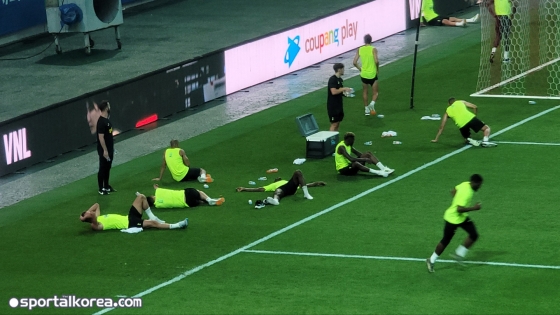 이날 훈련의 하이라이트는 막판에 나왔다. 축구화를 벗고 운동화로 갈아신은 선수들은 한쪽 골라인에서 반대편 골라인까지 뛰며 체력 훈련을 시작했다. 한국의 습하고 더운 날씨는 선수들의 체력을 금방 소진시켰다.