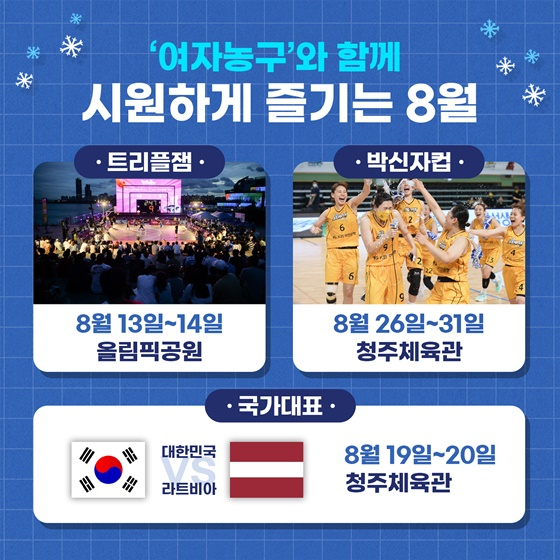 한편 8월 19일과 20일 청주체육관에서는 여자농구 국가대표 평가전이 열린다. 라트비아와 맞붙는 한국 대표팀은 8월 1일부터 진천 선수촌에서 본격적인 훈련에 돌입한다.