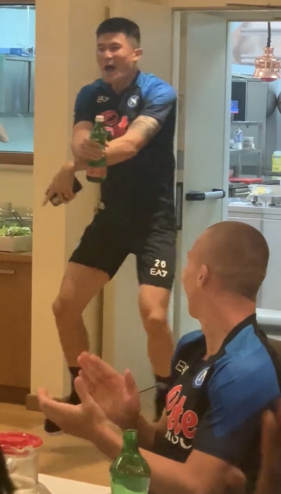 입단 첫날부터 화제다. 영입생이면 반드시 통과해야 하는 신고식에서 유쾌한 성격을 과시했다. 김민재는 새로운 동료 앞에서 노래와 춤을 추는 신고식 자리에서 싸이의 세계적인 히트곡 강남스타일을 택했다. 부끄러움 없이 노래를 부른 김민재는 말춤으로 동료들의 환호를 이끌어냈다. 나폴리 선수들도 강남스타일을 따라부르고 함께 손뼉치며 김민재의 신고식을 즐겼다.