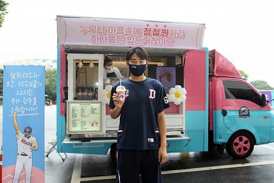 누군가의 팬이었던 선수가 어느덧 인기 선수의 상징이라고 할 수 있는 커피차 선물까지 받았다. 바로 두산 베어스의 '신성' 정철원(23) 이야기다.