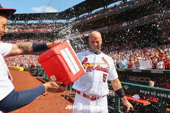알버트 푸홀스가 동료에게 물세례를 받고 있다./AFPBBNews=뉴스1