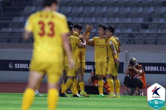 K리그2에서 독주하는 광주FC의 힘이다. 광주가 2위권과 격차를 14점까지 벌렸다. 지난 20일 목동종합운동장에서 열린 하나원큐 K리그2 2022 34라운드 원정 경기에서 서울이랜드를 4-0으로 대파했다. 이날 승리로 19승9무3패(승점 66)를 기록한 광주는 우승을 향한 독주를 이어갔다.