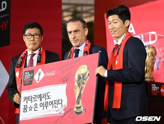 차범근과 박지성은 24일 서울 여의도 더 현대 서울 사운드 포레스트에서 열린 FIFA 월드컵 카타르 2022 트로피 투어 행사에 한국 축구 레전드 자격으로 참석해 후배들을 향해 응원 메시지를 전했다.