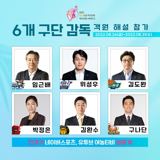 한국여자프로농구연맹(WKBL)은 26일 '2022 KB국민은행 박신자컵 서머리그'에 임근배, 위성우, 김완수 등 WKBL 6개 구단 감독들이 중계방송 객원 해설자로 나선다고 이날 밝혔다.