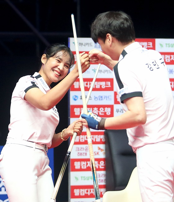 프로당구협회는 26일 "2022~2023시즌 '웰컴저축은행 PBA 팀리그' 6세트에 치러지는 남녀혼합복식에서 블루원리조트가 강민구-스롱피아비 조합은 6승1패를 챙겨 가장 좋은 성적을 남겼다"고 소개했다.