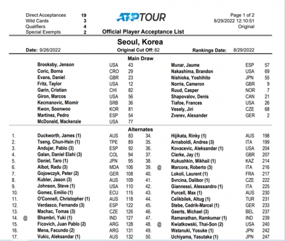 조직위은 "본선 자동 진출자 19명 중 투어 대회에서 1회 이상 우승자만 14명이고, 결승 진출자도 4명"이라며 "투어 결승 경험이 없는 선수는 마르코스 기론(29·미국)뿐으로 누가 결승에 올라도 이상할 것이 없는 초호화 라인업이다. 그 중 즈베레프, 초리치, 노리, 프리츠는 마스터스 우승자"라고 설명했다.