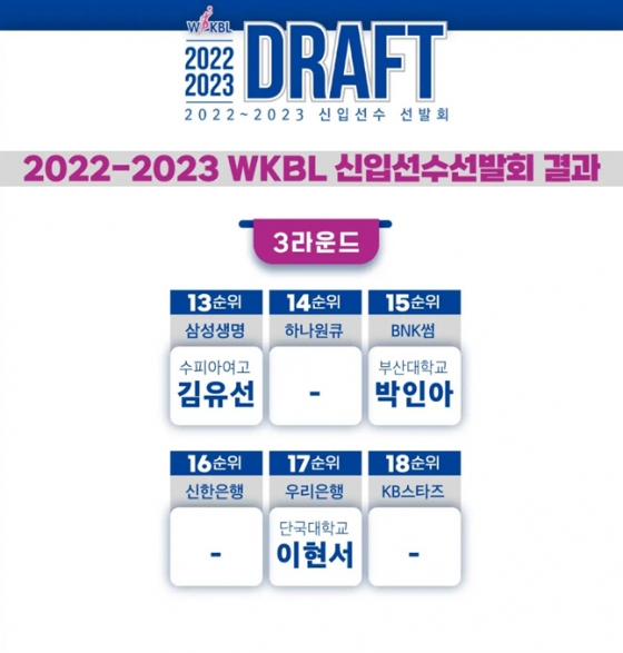 이어 3라운드 1순위는 삼성생명이 김유선(18·수피아여고)을 지명한 가운데 BNK썸은 부산대 졸업 예정인 박인아(22)를 3라운드 3순위로, 우리은행은 단국대 졸업 예정인 이현서(22)를 3라운드 5순위로 각각 선발했다. 하나원큐와 신한은행, KB스타즈는 3라운드부터 지명을 포기했고, 마지막 4라운드에선 다른 팀들도 모두 지명을 포기하면서 드래프트의 막을 내렸다.