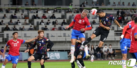 김민재가 23일 오후 경기 고양종합운동장에서 열린 대한민국과 코스타리카의 친선경기에서 상대문전을 향해 헤딩슛을 시도하고 있다. /사진=뉴스1