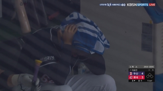 두산 최승용이 3일 사직 롯데전에서 5회말 마운드를 내려간 후 더그아웃에 앉아 고개를 숙이고 있다. /사진=KBS N 스포츠 중계화면 갈무리