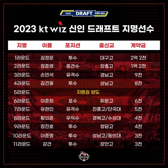 한편, KT는 5일 삼성 라이온즈와의 홈경기에 2023 신인 선수 초청 행사도 진행한다. 경기 전 신인 선수 및 가족과 함께하는 오리엔테이션이 진행되고, 1라운드로 지명된 김정운과 2라운드 정준영이 각각 시구 및 시타를 맡는다. 5회말 종료 후에는 신인 선수 10명이 그라운드에서 팬들에게 첫 인사와 각오를 전할 예정이다.