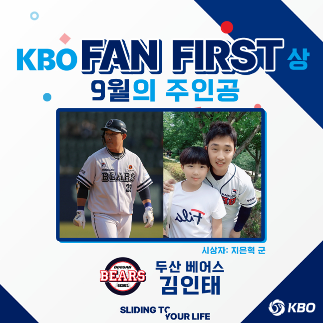 KBO는 "리그 선수와 특별했던 팬 서비스 경험 및 사연을 접수 받아 진행되는 「KBO FAN FIRST(팬 퍼스트)상」의 9월 수상자로 두산 김인태를 선정했다"고 4일 밝혔다.