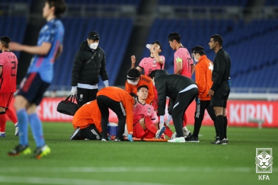 지난해 3월 일본 원정에서 부상으로 들것에 실려 나가고 있는 미드필더 정우영. /사진=대한축구협회