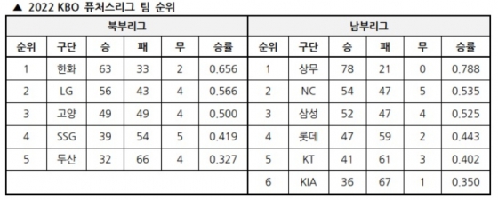북부 리그는 한화 이글스가 지난해 19경기 차로 1위에 올랐던 LG를 8.5게임 차로 제치며 2019년 이후 3년 만에 우승을 차지했다. 남부리그는 상무 야구단이 2012년 이후 11년 연속 정상에 등극했다.