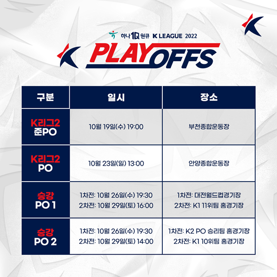 - 1차전 : 10/26(수) 19:30 / K리그2 PO 승자 vs K리그1 10위 / K리그2 PO 승자 홈구장