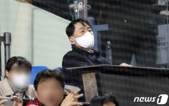 이장석 전 히어로즈 대표가 25일 서울 송파구 잠실구장에서 열린 2022 신한은행 SOL KBO 포스트시즌 플레이오프 2차전 키움 히어로즈와 LG 트윈스의 경기를 직접 지켜보고 있다. /사진=뉴스1