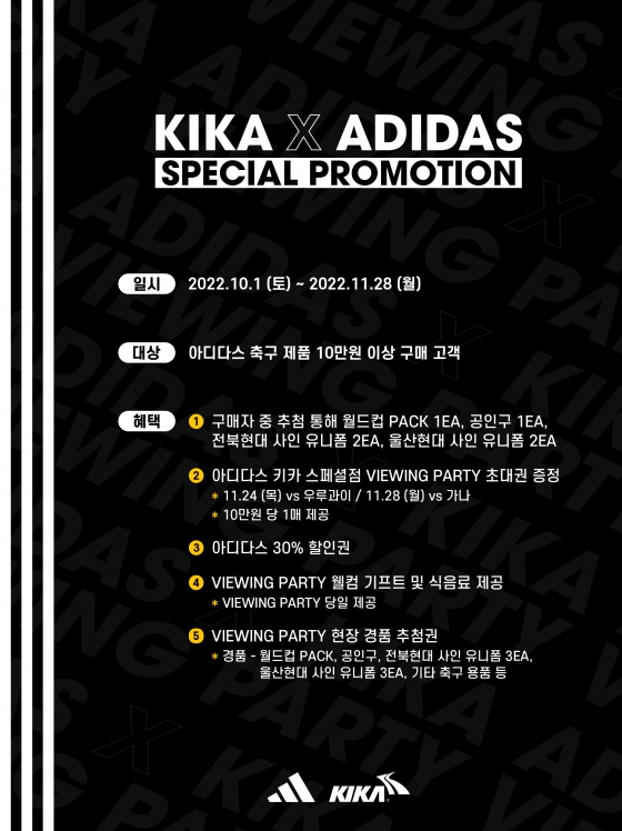 키카는 오는 24일과 28일로 예정되어 있는 대한민국 축구국가대표팀의 월드컵 H조 조별예선 2경기 뷰잉파티를 진행한다. 뷰잉파티 참여 대상은 아디다스 키카스페셜서울 매장에서 10만원 이상 구매한 고객이며, 뷰잉파티 참여자에게는 윌컴 스페셜기프트와 할인혜택, 식음료 등 푸짐한 혜택이 제공된다. 현장 추첨 이벤트도 진행될 예정이다. 이와 별도로 행사 기간 내 구매 고객을 대상으로 추첨을 통해 아디다스 월드컵 PACK 축구화와 월드컵 공인구 ‘알 리흘라’, K리그 대표구단인 전북현대와 울산현대의 유니폼을 지급한다.