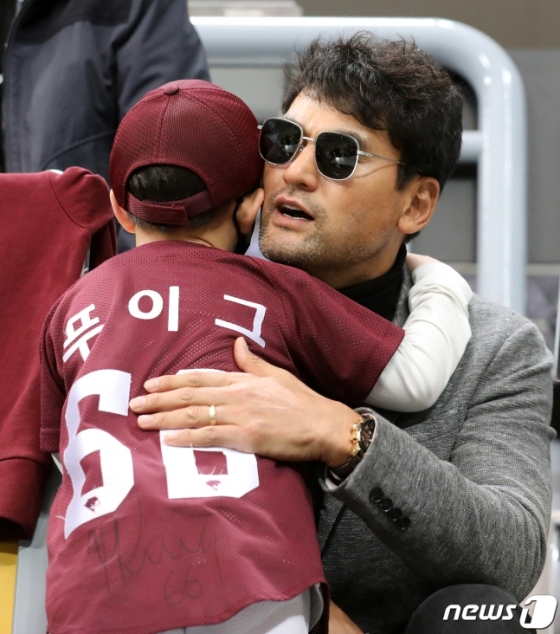 박찬호가 5일 한국시리즈 4차전이 열린 고척스카이돔을 찾아 한 어린이 팬과 포옹을 하고 있다. 2 /사진=뉴스1