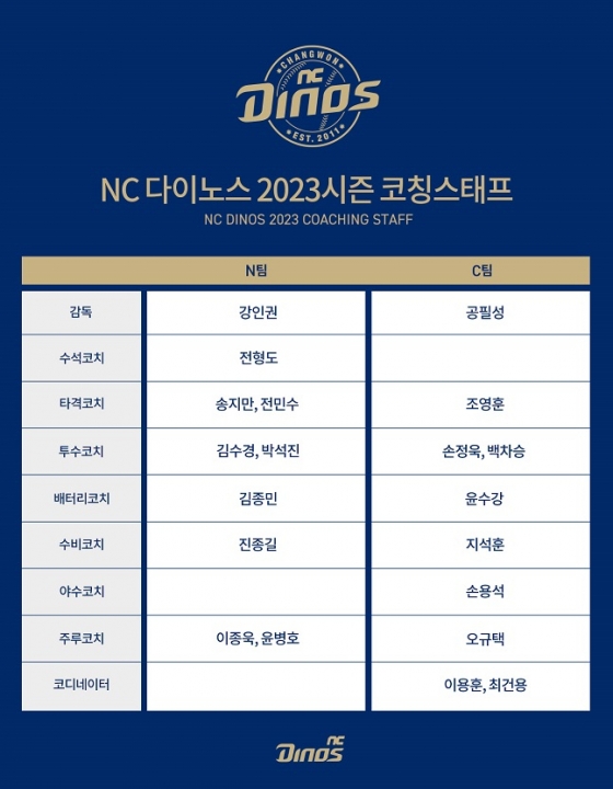 N팀(NC 1군)은 전형도 수석코치가 새로 합류해 강인권(50) 감독의 지원군 역할을 맡을 예정이다. 전 코치는 현역 시절 한화와 두산에서 뛰었고 은퇴 후에는 휘문고 야구팀 감독으로 지도자 생활을 시작했다. 이후 두산과 한화를 거쳐 지난해부터 SSG 랜더스의 작전주루 코치로 활약했다. 강 감독과는 두산과 한화에서 코치 생활을 함께하며 야구관에 대한 공감대를 쌓았다.