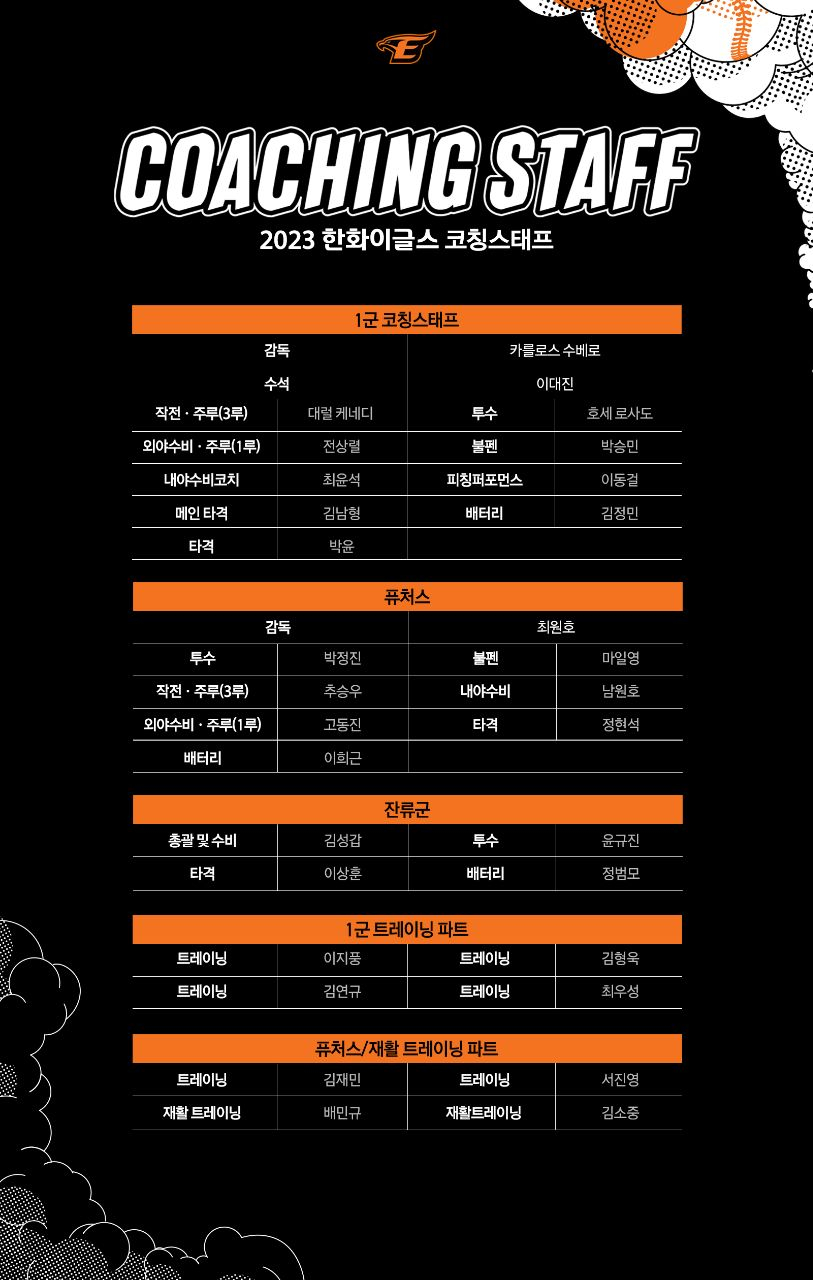 한화는 "14일 2023시즌 코칭스태프 보직을 확정했다"면서 "1군은 카를로스 수베로 감독을 필두로 경험이 풍부한 국내 코칭스태프 영입을 통해 변화를 꾀한다"고 밝혔다.