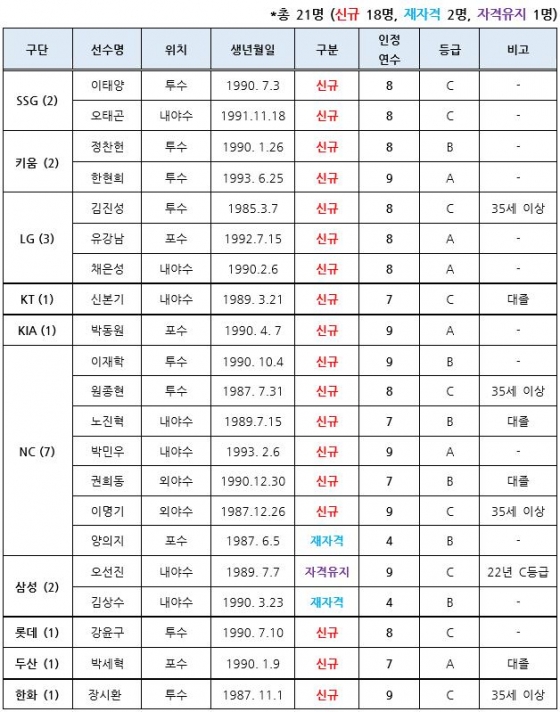 KBO는 16일 "2023년 FA 자격 선수로 공시된 40명 중 FA 승인 선수 21명의 명단을 공시했다"고 밝혔다.