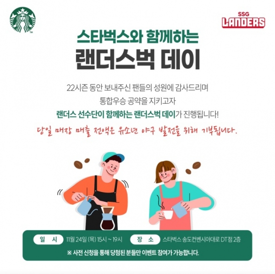 SSG는 "24일 오후 3시부터 7시까지 4시간 동안 스타벅스 송도컨벤시아대로 DT점 2층에서 스타벅스와 함께하는 '랜더스벅 데이' 이벤트를 개최한다"고 21일 밝혔다.