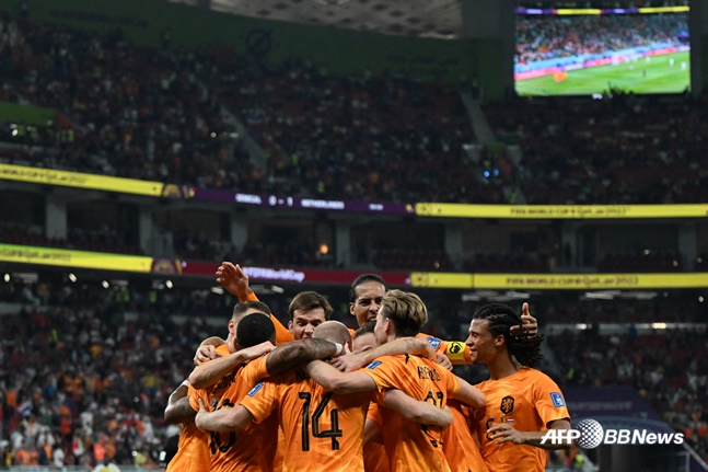 네덜란드 선수들이 22일 오전 1시(한국시간) 카타르 도하 알투마마 스타디움에서 열린 2022 FIFA(국제축구연맹) 카타르 월드컵 조별리그 A조 1차전 세네갈과의 경기에서 후반 추가시간 데이비 클라센의 골이 터지자 기뻐하고 있다. /AFPBBNews=뉴스1