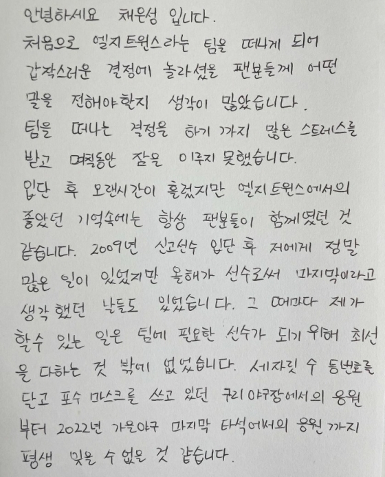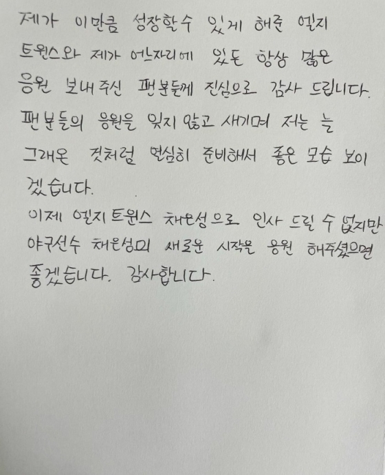 그러면서 "이제 LG 트윈스 채은성으로 인사드릴 수 없지만 야구선수 채은성의 새로운 시작을 응원해주셨으면 좋겠다"고 당부의 말도 전했다.