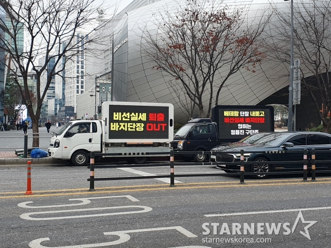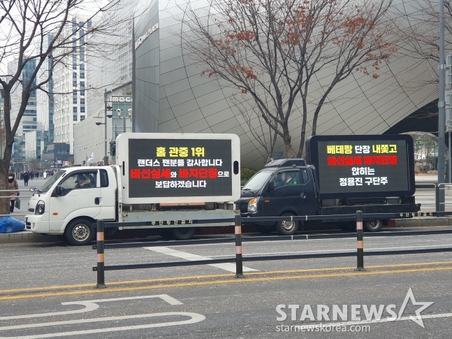 15일 서울 마포구 상암동에 위치한 YTN 본사 앞에는 일부 SSG 팬들이 보낸 시위 트럭이 등장했다. 트럭 2대에는 '비선실세 퇴출-바지단장 OUT', '베테랑 단장 내쫓고 비선실세 바지단장 앉히는 정용진 구단주', '<인원 채용> 포지션 : 프로야구팀 단장, 자격요건 : 구단주와 친분', '홈 관중 1위 랜더스 팬분들 감사합니다. 비선실세와 바지단장으로 보답하겠습니다'라는 등의 항의 문구가 쓰여 있었다. 이번 트럭 시위는 신세계 백화점 본점이 있는 서울 명동 등지에서 오는 17일까지 사흘간 계속될 예정이다.