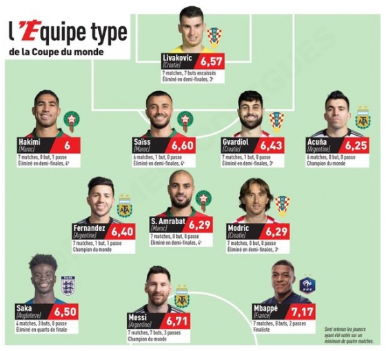 공격수에는 메시(아르헨티나)와 음바페(프랑스), 부카요 사카(잉글랜드)가 선정됐다. 미드필더진에는 모드리치(크로아티아), 암라바트(모로코), 엔조 페르난데스(아르헨티나)가 이름을 올렸다. 수비진에는 아쿠나(아르헨티나), 요슈코 그바르디올(크로아티아), 로망 사이스(모로코), 하키미(모로코)가 배치됐다. 골키퍼에는 리바코비치(크로아티아)가 선정됐다.
