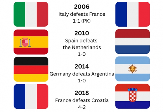 2000년대 이후 월드컵의 가장 큰 특징 중 하나는 유럽팀의 압도적인 강세였다. 2006년 이탈리아를 시작으로 2010년 스페인, 2014년 독일, 2018년 프랑스까지 4회 연속 유럽팀이 월드컵 정상에 올랐다. 그 전까지 같은 대륙에서 우승팀이 연속으로 나온 건 1958년과 1962년 브라질의 2연패가 마지막이었다. 이후 남미와 유럽에서 번갈아 우승팀이 나오던 오랜 흐름이 2000년대 들어 깨진 것이다.