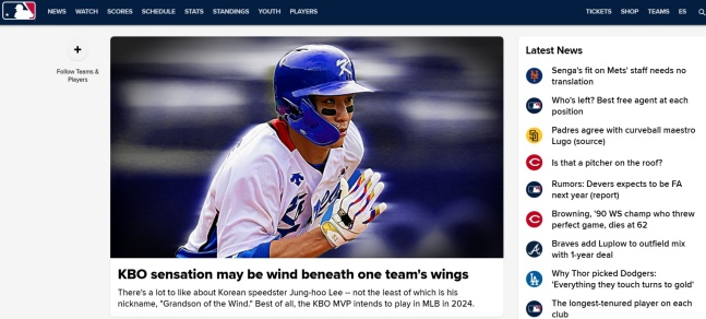 이정후(23·키움 히어로즈)가 미국 메이저리그(ML) 공식 홈페이지 메인을 점령했다.