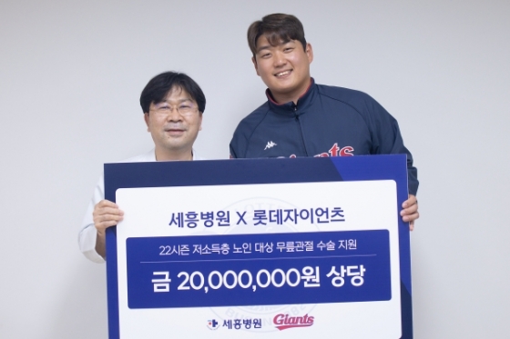 이날 세흥병원에도 롯데 자이언츠 나균안이 함께한 가운데, 저소득층 노인을 위한 2천만원 상당의 무릎 수술을 지원하는 전달식이 열렸다.
