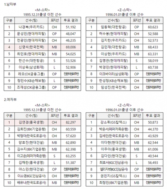 한편 이번 온라인 팬 투표는 지난 12일부터 18일까지 7일간 홈페이지를 통해 진행돼 남녀 M-스타와 Z-스타 팀당 7명 등 총 28명의 스타들이 팬들의 선택을 받았다. 투표수는 총 395만 6512표, 1일 평균 투표수는 56만 5216표로 집계됐다. 이는 지난 해 대비 약 66% 증가한 수치(2021~2022시즌 1일 평균 투표수 339,038표, 투표 기간 2021년 12월 10~23일 2주간)이다. 여기에 균형 잡힌 선수 구성을 위해 전문위원회 추천을 통해 총 12명을 추가로 선발했다.