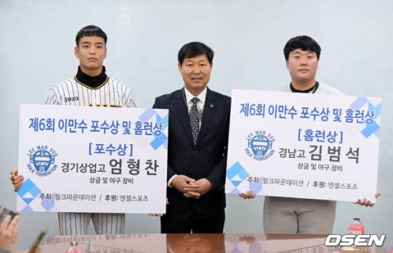 LG 트윈스의 대형 신인 포수 김범석(18·경남고)과 미국 메이저리그 캔자스시티에 입단한 엄형찬(18·경기상고)이 이만수 홈런상과 포수상을 각각 수상했다.