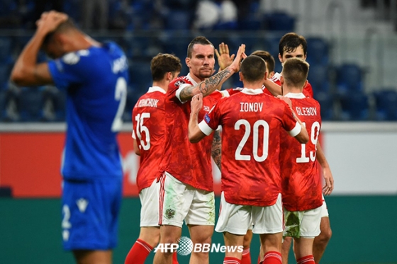 러시아 축구대표팀 선수들이 지난해 11월 키프로스와의 월드컵 예선에서 골을 넣은 뒤 기뻐하고 있다. /AFPBBNews=뉴스1